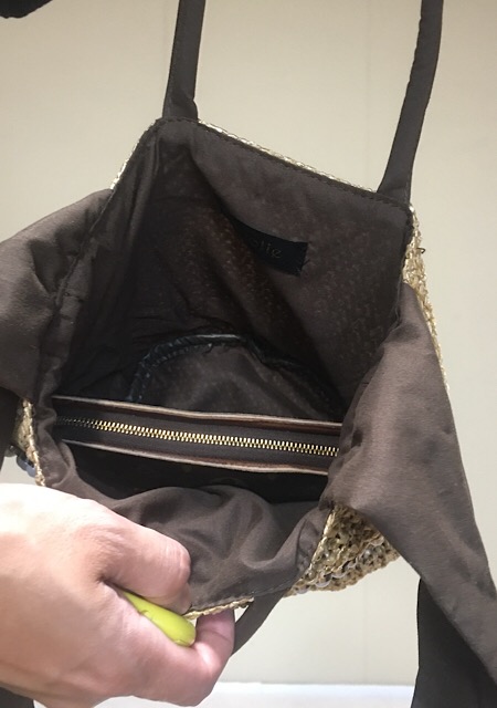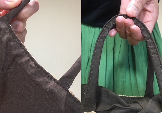 裏地と同じ生地の取っては、見た目ほど細くはなく、しっかりした作りです↓
