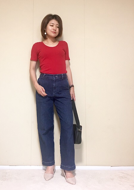 濃紺の落ち着いたカラーを鮮やかな赤トップスとドッキングすることで、上品な血色upスタイルへと導いてくれるはず。