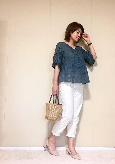 トップスインが苦手なら、ゆったりとしたブラウスをアウトした着こなしはいかがでしょうか。