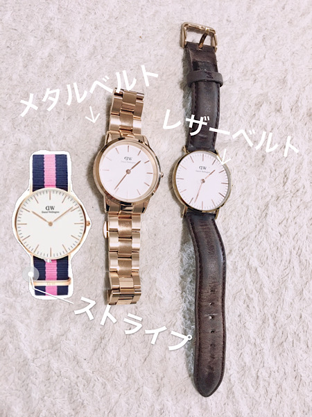 ダニエルウェリントンの時計は、定番のレザータイプや可愛いトリコロールなど、デザインやカラーのラインナップが豊富。