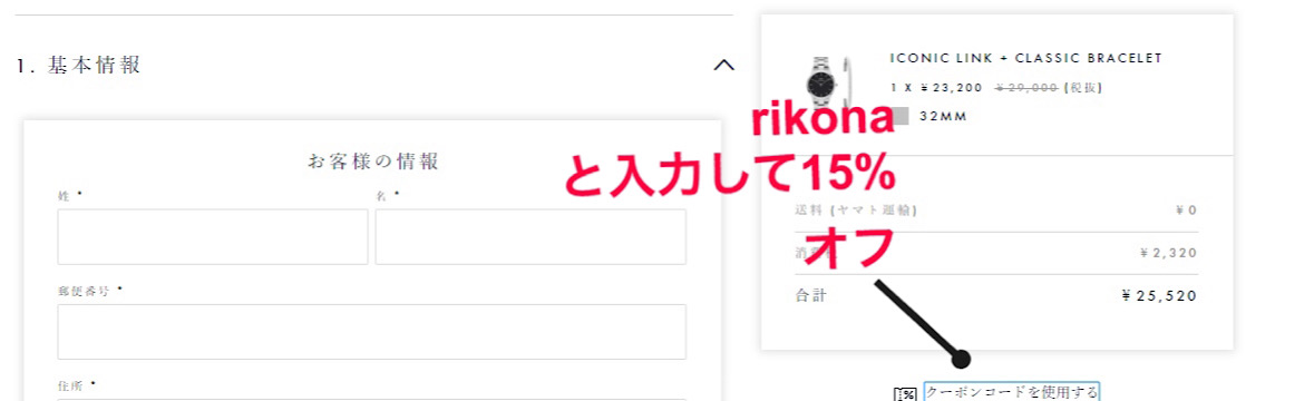 更にダニエルウェリントンの直営店又は公式サイトで商品購入の際、【クーポンコードを使用する】をクリックし、『rikona』をご入力いただくと、今回ご紹介した新作腕時計 Iconic Linkシリーズを含めたすべての商品を15%OFFで手に入れることができますよ。