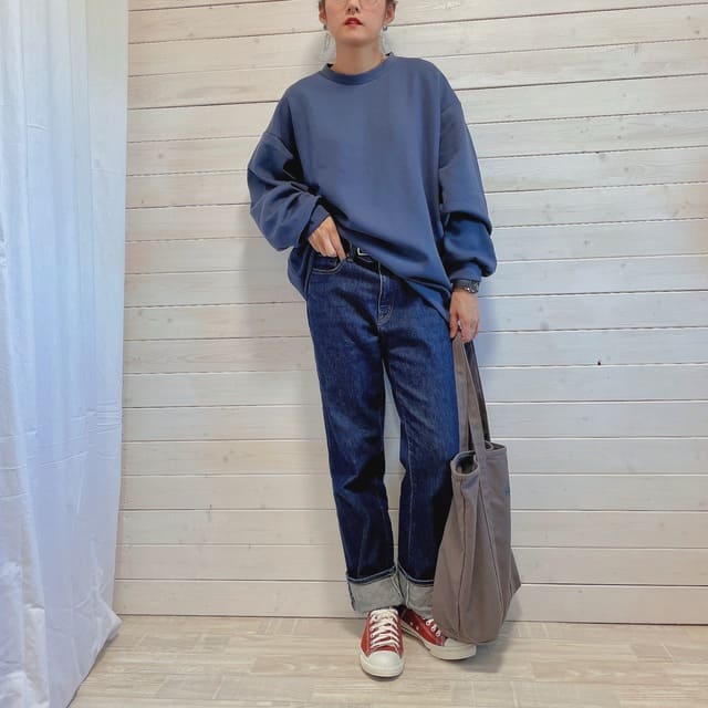 上下くすんだブルーなので、靴もくすんだカラーをチョイスして、統一感をアップ!