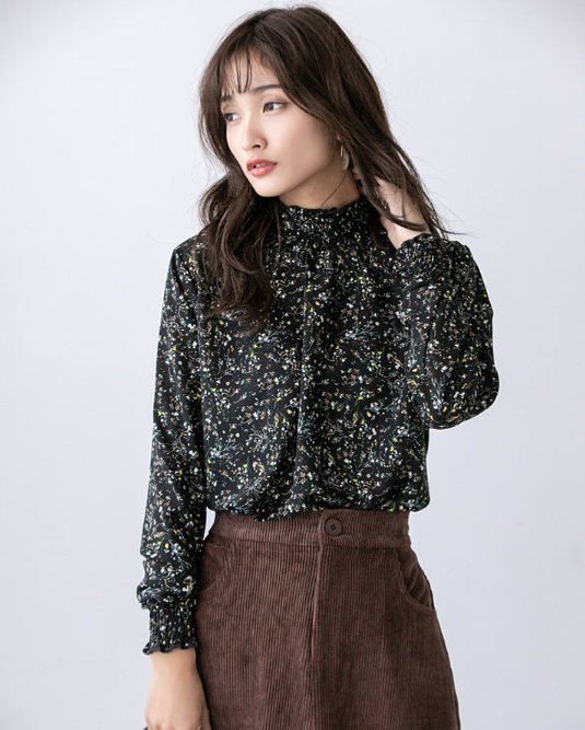 ブラウスは真っ黒もいいですが、花柄などのプリントタイプがおすすめ!