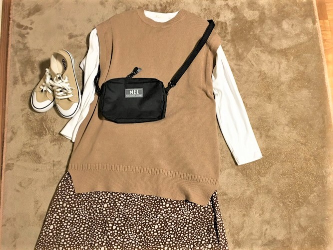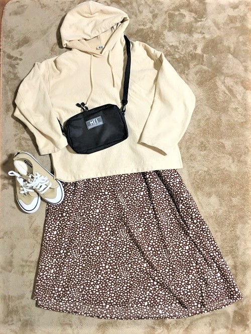 MEIのバッグがシンプルだから、柄物スカートを合わせてもごちゃごちゃ見えません。