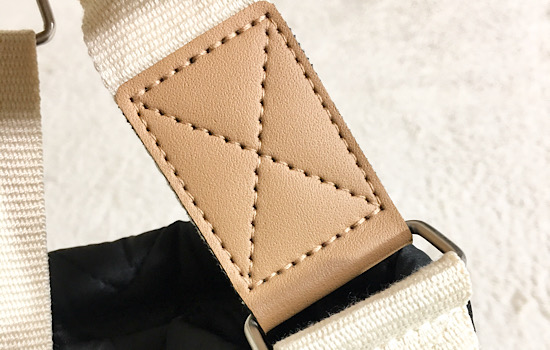 劣化しやすいランキングトップ3に入る本体と接続するストラップ部分。ショルダーと馴染みやすいベージュのレザー風の素材を使用しており、丈夫なだけでなく高見えも叶います!