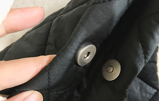 バッグの開閉口についているおしゃれなスナップボタン、実はマグネット!きっちり閉まるので、セキュリティも万全です。