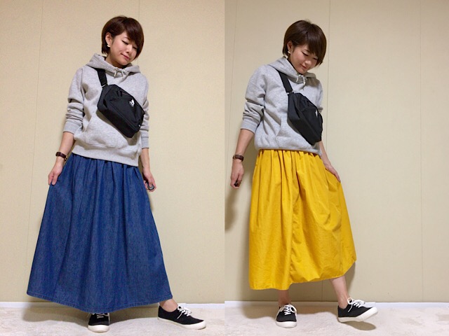 先程のオーバーサイズのパーカーに、ロングスカート、足元はバッグと同系色のスニーカー合わせ♪