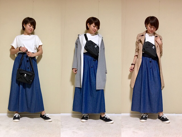 先程のデニムスカート×Tシャツにロングの羽織りをプラス♪