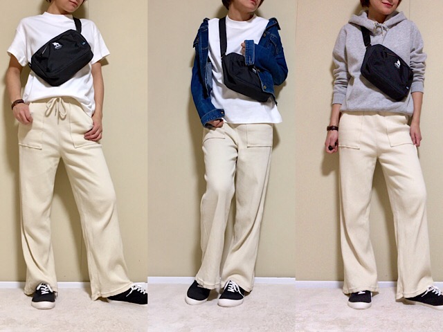 ショルダーバッグのロゴが白なので、上半身に白を持ってくるとバランスが良いです。