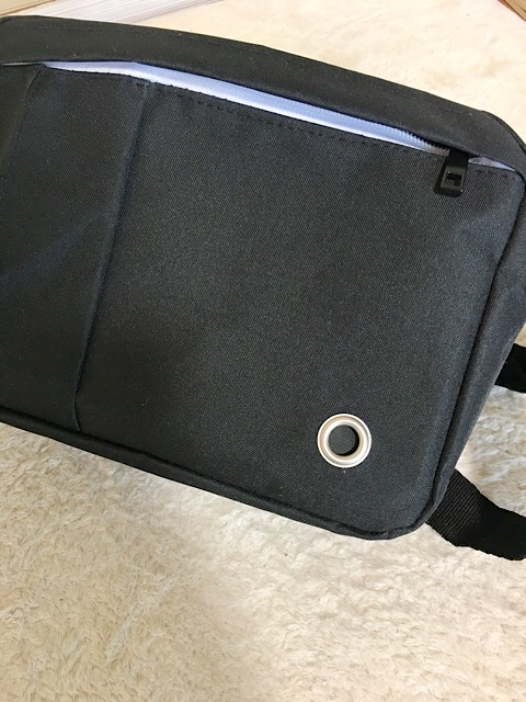 背面右側にはイヤホンやモバイルバッテリーのコードを通せる、丸い穴がついています。