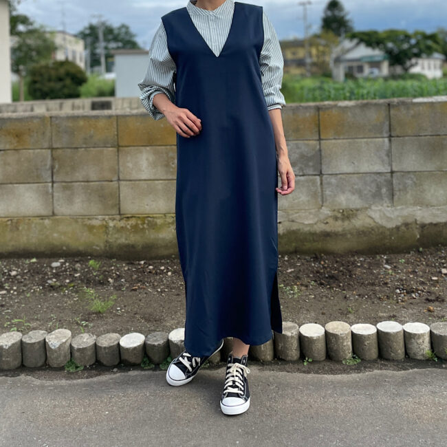 今回着用したPierrot 【 ピエロ 】のジャンパースカートは、スッキリ見えるVネックが魅力的なデザイン。