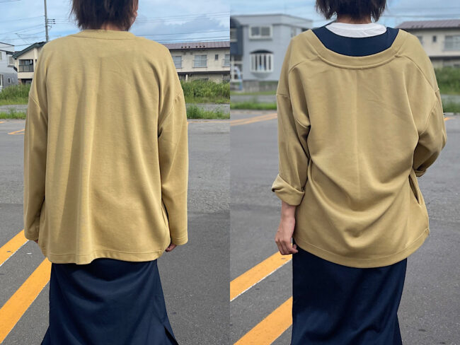 左がそのまま着たパターン:右が後ろに引っ張って着たパターン