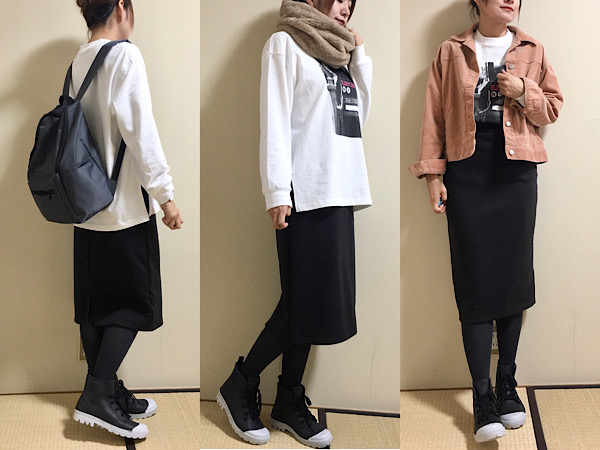 モノトーン好きのわたしはブラックをセレクト。真っ黒よりも軽やかに仕上がるから使いやすい!実際のコーディネートをご覧ください^^