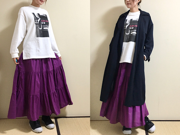 華やかなパープルスカートが落ち着いて見えるのは、モノトーンブーツだからこそ成せる技です。