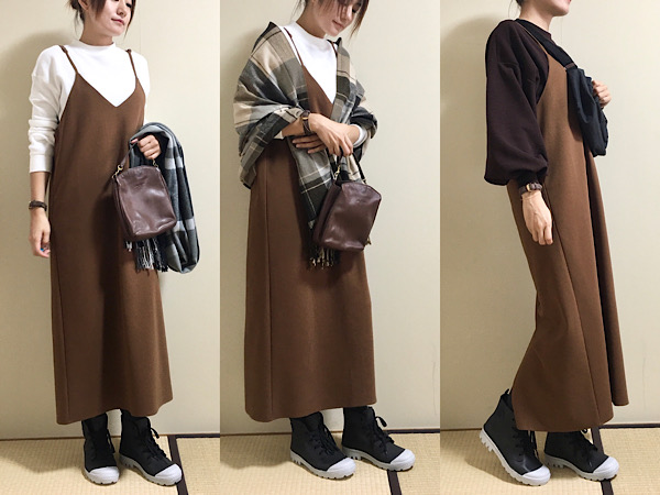 【レインブーツのレディースコーデ】無地プルオーバー×キャミワンピース