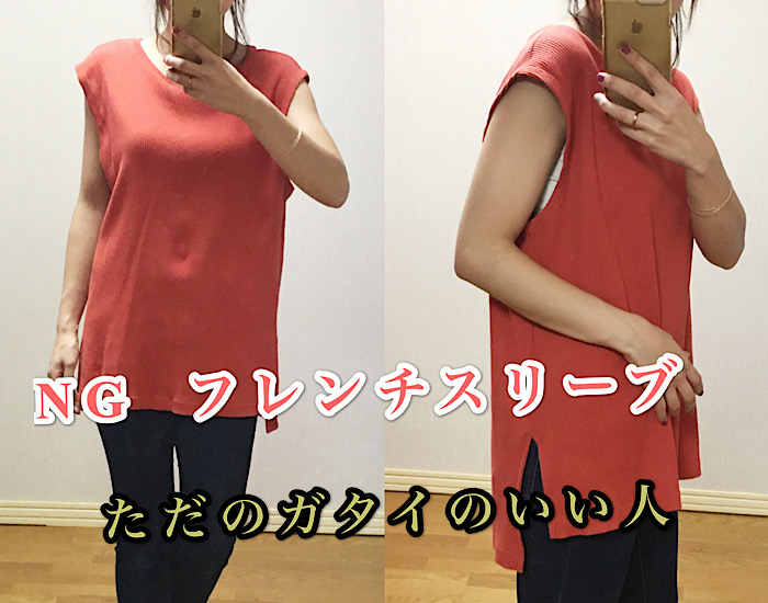 ▼フレンチスリーブは、骨感の強い肩をさらに勇ましく見せる恐れも…。