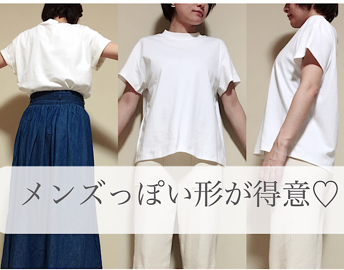 男女兼用で着られるような、生地の厚いゆったりたサイズ感の半袖トップスが良く似合います!